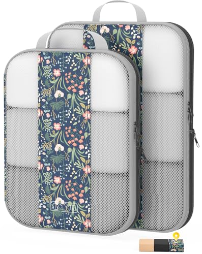 2 Set Compression Packing Cubes for Travel Essentials,Compressible Expandable Packing Cubes for Suitcase,OlarHike Luggage Organizer Bags for Travel(Dark Blue Floral)