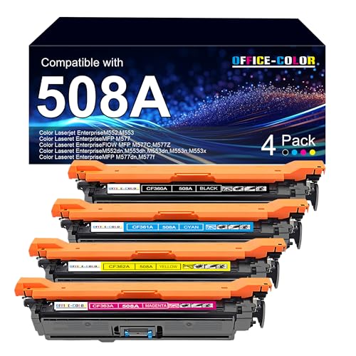 Compatible Printers hp m553 toner,M552 toner,Color Laserjet Enterprise MFP M577, Color LaserJet Enterprise Flow MFP M577c, M577z; Color LaserJet Enterprise M552dn, M553dh, M553dn, M553n, M553x,Color LaserJet Enterprise MFP M577dn, M577fWhat's in the Box: 4 Pack Replacement for HP 508A toner cartridges (1 Black, 1 Cyan, 1 Magenta, 1 Yellow)High Page Yield: 6,000 pages black toner cartridge and 5,000 Pages color toner cartridge at 5% coverage (Letter/A4)Tips: 508A m553 toner cartridges adapt latest upgraded chip that can be quickly recognized by the printer.Reliable Quality:Delivers Sharp Texts, Crisp Images, and Stable Compatibility, No Fading, No powder leakage, No Streak