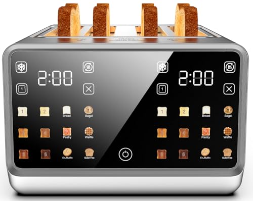 4 Slice Toaster– Dual Digital Smart TouchScreen & Independent Control Panel | Single-Slot Tech, Timer/Reheat/Defrost for Bagels, Bread | 1800W Stainless Steel, 6 Toast Types & Shade Settings