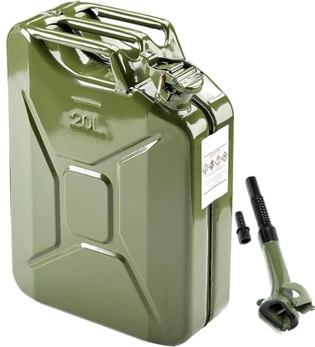 0.8mm heavy Gauge Steel finished, 5 Gallon Maximum Capacity.Great for everyday shop and automotive uses, or keep on hand for emergencies.It's effortless for one or two individuals to carry.Metal pouring spout with flexible rubber extention.Coated inside to prevent corrosion, Robust ripple handle design.