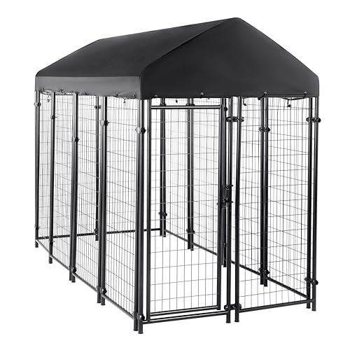Large outdoor wire kennel provides a secure pet play area for a canine friend; swing-open door for easy in/out accessMade of durable materials, including metal wire, for safety, optimal stability, and long-lasting strength; sets up easilyWeatherguard cover offers waterproof protection, keeping pet protected from snow, wind, rain, and other outdoor elementsSuitable for indoor/outdoor use; plugs included to protect indoor flooring; surfaces wipe clean with a damp clothMeasures 102 by 48 by 72 inches (LxWxH); weighs 129.5 pounds; backed by an Amazon Basics 1-year limited warrantyRecommended for small, medium, and large breeds (13 - 110+ lbs)