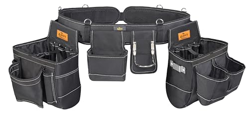 6 Pcs Value Pack-- 2 large tool pouchs with handle for easy carrying(L*W*H-9*8.5*8 inches), 1 small tool pouch for screws and other small tools(L*W*H-6*3*4.5 inches), 1 hammer holder, 1 padded waist belt with velcro, and 1 adjustable double grommet waist belt.Large Capacity and Versatility--31 Pockets and Loops for easy organization(2 large pouches size: L*W*H 9*5.5*8 inches), 2 snaps for speed squares, 1 tape measure clip, 1 hammer holder, 1 water bottle pockets. It can easily organize a variety of tools, such as drills,screwdrivers,pliers,wrenches,tape measure,water bottles,plugs, multimeter,tape,knife,hand drill lithium batteries and so on. You could put a lot of tools in it without having to go back-and-forth.High Quality 600DPremium Tool Rig-- This tool belt is made of 600D denier polyester. All the hardware is heavy duty, all the stitches are reinforced. It's worth to try.Adjustable Padded Waist Blet-- Width 3 inches waist belt with padded makes your waist more comfortable. The double grommet waist belt could be adjusted from 36” to 49” inches.Easy to Match-- There are 4 D-ring buckles on the belt, so you can easily match your suspender(The suspender needs to be purchased separately).