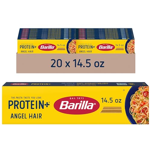 BARILLA PROTEIN PLUS PASTA: Good source of plant-based protein with a classic taste, simple ingredients, and angel hair pasta shapePROTEIN PLUS ANGEL HAIR PASTA: Each 14.5 ounce box contains about 7, 2-ounce servings of plant based pastaPLANT BASED PASTA: Made with 17g of 100% plant-based protein from lentil flour, pea protein and chickpea flour per 3.5 oz. serving—it's a good source of fiberKOSHER CERTIFIED and NON-GMO PASTA: Barilla protein pasta is Non-GMO Project Verified, kosher certified and is made in the USAGREAT WITH YOUR FAVORITE SAUCE: Protein Plus tastes great served with pesto sauce or your favorite marinara sauce Protein Plus pasta pairs well with vegetable pasta sauce, cheese sauce, oil or butter-based pasta sauce and meat sauceBARILLA PROTEIN plus : A delicious alternative to other brands of high protein pasta, protein spaghetti, protein noodles and other types of high protein foodPERFECTION IN UNDER 10 MINUTES: Boil 4–6 quarts of salted water, add pasta and boil for 4 minutes (add 1 or 2 extra minutes for more tender pasta), drain pasta and top with your favorite Barilla pasta sauceANGEL HAIR PASTA: Dress up angel hair with lobster or hearty pesto and pepper sauceGet inspired with Barilla Enjoy the full range of Barilla pasta and pasta sauces, including Ready Pasta, Protein plus Pasta, Whole Grain Pasta, Gluten Free Pasta, Chickpea Pasta and Red Lentil Pasta.Get inspired with Barilla Enjoy the full range of Barilla pasta and pasta sauces, including Ready Pasta, Protein plus Pasta, Whole Grain Pasta, Gluten Free Pasta, Chickpea Pasta and Red Lentil Pasta.