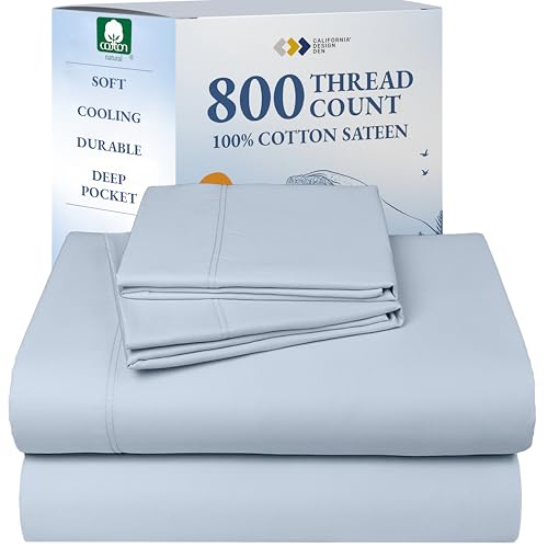California Design Den Cotton Bed Sheets Queen Size Set - Luxury Hotel 800 Thread Count Sateen, Natural 100% Cotton Sheets Queen Size Set, Durable Deep Pockets with Anti-Skid Elastic - Light Blue