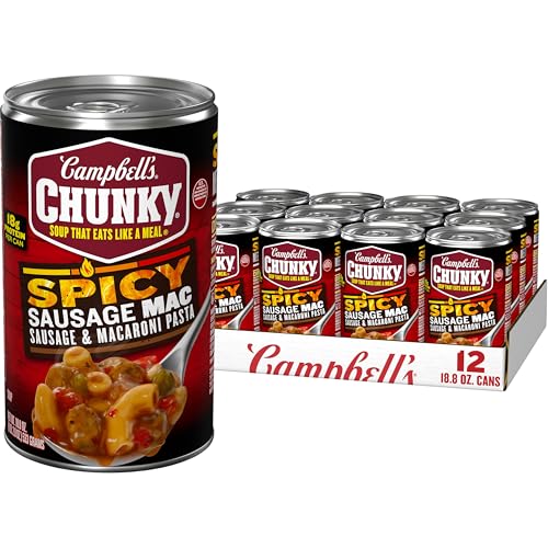 Twelve (12) 18.8 oz cans of Campbell’s Chunky Spicy Sausage Mac SoupChunky Italian sausage soup with big pieces of sausage, macaroni pasta, and red and green peppers, plus the perfect amount of spice for a bold kickWith 18g of protein per can, this satisfyingly spicy soup fuels even the heartiest of appetitesCampbell’s Chunky Soup is a year-round pantry staple and the MVP of game day snacks, delivering a winning combination of flavor and convenienceEnjoy a warm bowl of this canned soup when watching the game from home, or savor it at your next tailgating event