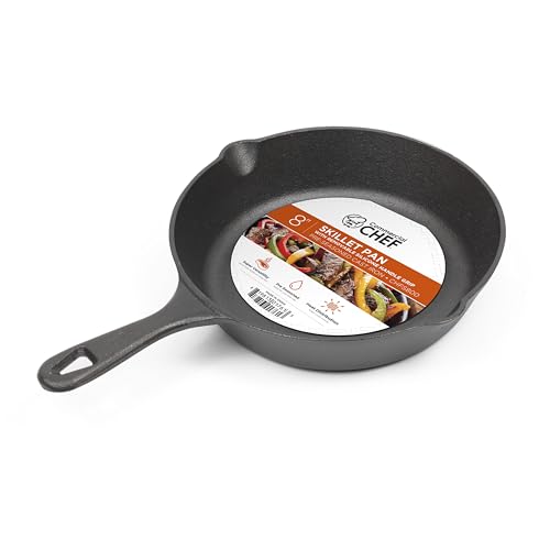 VERSATILITY: This COMMERCIAL CHEF 8-inch cast iron skillet can be used on a stove top, in an oven, broiler or even outdoors at a campfire. Sear, bake or fry delicious meals with this cast iron skillet pan or even use as a serving dish from kitchen to table.PRE-SEASONED: Our cast iron cookware is seasoned with 100% vegetable oil with no synthetic coatings. Simply handwash with gentle detergent and dry with a towel.EVEN HEAT DISTRIBUTION: Cast iron cookware offers consistent, even heating and great heat retention. This pre-seasoned cast iron cookware is well-oiled for an easy-release cooking surface that also helps prevent your new pan from rusting.POUR SPOUT FEATURE: Easily get rid of excess oils and fats from your 8-inch iron cast skillet with a convenient pour spout end. This bonus feature also allows you to season or marinade your delicious meals by simply pouring savory juices and seasoning to any delectable dish.