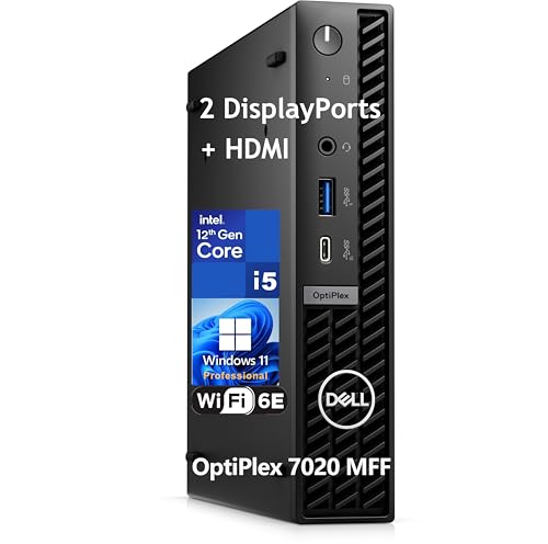 With its compact design, the Dell OptiPlex 7020 Mini Desktop Computer can fit into tight workspaces, brought on location, and carried on commutes. Despite its small size, this enterprise-class computer can take on demanding workloads with its 12th Gen Intel Core i5-12500T (18 MB cache, 6 cores, 12 threads, 2.00 GHz to 4.40 GHz Turbo).Graphics: The integrated Intel UHD Graphics 770 chipset delivers a sharp, clear picture while allowing for 3 monitors to be used via its 1 HDMI and 2 DisplayPorts.RAM and Storage: 16GB DDR5 RAM; Hard Drive: 512GB M.2 PCIe NVMe SSD. Optical Drive: No.Intel Wi-Fi 6E AX211, 2x2, 802.11ax, Bluetooth wireless card. Front: 1x Universal Audio Port, 1 USB 3.2 Gen 1 (5 Gbps) Type-A Port with PowerShare, 1 USB 3.2 Gen 2x2 (10 Gbps) Type-C Port; Rear: 1 RJ-45 Ethernet Port, 1 USB 2.0 Type-A Port (480 Mbps), 1 USB 2.0 Type-A Port (480 Mbps) with SmartPower On, 2 USB 3.2 Type-A Gen 1 (5 Gbps) Ports, 2 DisplayPort 1.4a Port, 1 HDMI 1.4b Port, 1 Power Adapter Port.Operating System: Windows 11 Professional, English. Keyboard and Mouse (Black) included. The whisper-quiet and ultra-small Dell OptiPlex 7020 Mini fits easily into most small bags, making it the right choice for desktop users who need to move between the home and office. Mount it behind a compatible monitor.