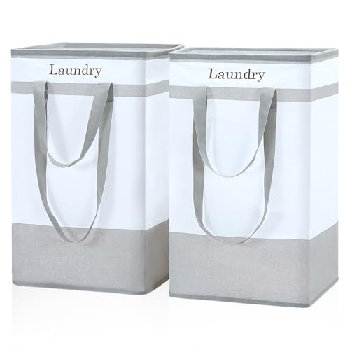 Large Capacity: Each laundry basket holds up to 100 liters, making it ideal for handling large loads of laundry. No more frequent trips to the laundry room; our baskets can hold it all. Laundry hamper size: 15.75"L x 14.96"W x 25.59"H.Easy to Carry: Our laundry baskets equipped with long and short handles, convenient for hand or shoulder carrying. Whether you're carrying laundry up and down stairs or across the house, our hampers for laundry make the task manageable and strain-free.Durable & Waterproof Fabric: Laundry hampers crafted from high-quality polyester fabric with a waterproof coating, these baskets are built to last. The waterproof layer ensures your laundry stays dry and protected, even in damp environments.Freestanding Structure: Thanks to the sturdy frame on top, the clothes hamper stands upright and maintain its shape. For optimal stability, distribute clothes evenly inside without placing them over the edge to maintain balance and prevent collapse.Collapsible Design: Space-saving has never been this easy. When not in use, simply fold the collapsible laundry baskets flat and tuck them away. Perfect for apartments, dorm rooms, or any space-conscious environment.