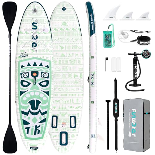 New TIKI is coming! The stylish TIKI pattern combined with the background of human's magnificent civilisation change to create the new TIKI inflatable paddleboard. This board not only represents FunWater's keen insight into trends, but also a unique tribute to human civilisation.Made from ultra-light excellent quality double wall PVC, FunWater SUP paddle boards are 35% lighter than similar size products, yet still maintain their durability and longevity. With size of 10'6" x 33" x 6", and an industry leading 350 LBS weight limit, these inflatable SUP boards are ready to tackle any challenge the water may throw at you. Come complete with premium accessories, it is perfect for all people.High-quality detachable double-ended paddle with efficient propulsion, strong bungee to expand the storage space, multi-functional camera base, 9 D-rings and unique tail-end handle to meet the diversified needs. Comfortable shoulder strap and large-capacity backpack facilitate easy transport. The white coiled leash ensures safe. Adopting advanced EVA colour blocking technology, more environmentally friendly and durable, no colour loss.From the design to the production process, FunWater ensures that every detail of the blow up paddle board meets high standards. Features oversized non-slip EVA decking for excellent durability, slip resistance and comfort. Comes with a high quality pump, the stand-up paddleboard can be easily inflated and rolled up for easy storage and transport. You can bring along your children and pets, making it perfect for various activities such as yoga, fishing, and sunbathing.Customer Service: Funwater not only has excellent products, but also has excellent customer service. Don't worry, if you have any questions about the inflatable paddle, please contact me and I will solve them for you.