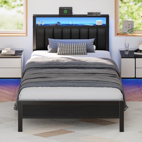 【Smart RGB LED Light】The bed frame is equipped with RGB light strip, which can be controlled by remote or mobile app. There are more than 60,000 colors of LED lights to choose from. There are also modes such as Style Mode, Music Mode, Microphone Mode and Timer Function for you to explore! You can freely set the brightness, color, mode that best suits your mood and environment, making the led bed frame a great addition to your bedroom.【Headboard with Charging Station】This bed headboard built -in 2 standard power outlet & 2 USB ports, which can totally charge your electronic devices at the same time. No need to struggle with messy cords or search for an available outlet - you can effortlessly charge your lamps, phones, and iPads all in one place.【Versatile Storage Solution】With 2-tier storage shelf on headboard, you can easily keep common small items such as phones, glasses, and books within easy reach. Enjoy a neat and organized sleeping space without compromising on functionality. Enhance your bedroom organization with our twin size bed frame featuring under-bed storage. This convenient hidden space provides ample room for storing suitcases, organizers, and other items.【Comfortable Upholstered Backrest】With the specially designed comfortable upholstered backrest, our bed frame ensures excellent support for your back while you relax or read in bed. The soft padding and high-quality upholstery material contribute to a restful and peaceful sleep experience.【Sturdy and Stable Structure】Crafted with durability in mind, our bed frame is made from high-quality materials that provide long-lasting stability and support, without needing a box spring. The robust metal slats structure offer a safe and comfortable sleeping experience for toddlers, kids and teens.【Easy to Assemble】Our bed frame is designed for effortless assembly, allowing you to set it up quickly and enjoy its benefits in no time. Additionally, the low-maintenance design of this twin size bed frame allows for easy cleaning and upkeep, making it a hassle-free choice for your bedroom.【Note】To prevent gaps at the headboard of the bed and ensure optimal comfort, please use a mattress that matches the exact size of this bed frame.