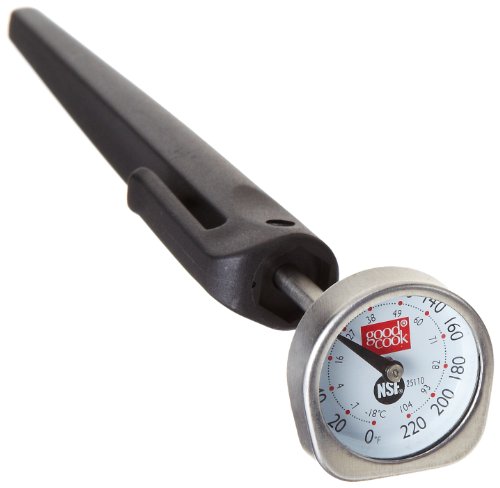 Safely measures the internal temperature of foods with stainless steel probe. Displays the reading in Fahrenheit and Celsius, ranging from 0° to 220°F and -18° to 104°C.Analog dial points to large bold digits on a compact display to indicate the internal temperature of meat, bread, casseroles, soups and more.Flat-sided design prevents the thermometer from rolling away when set aside.This thermometer is already calibrated for accuracy; tested and certified by NSF. However, it can be recalibrated if needed. A wrench tool is designed into our pocket sleeve for added convenience.Pocket sleeve keeps your hands safe and away from heat by extending your reach and clips onto pockets to have at the ready.