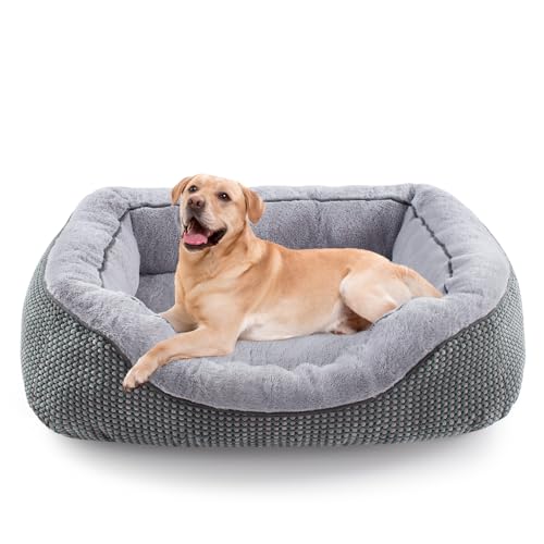 🐶COMFORT AS PRIORITY: The stylish rectangle shaped Supportive Raised Sides design creates a cozy and inviting space that promotes comfort and security; designed with Wide Side Bolsters for dogs to rest their heads on for optimum lounging comfort. Low leading-edge design is easy access for small and old dogs.🐶ULTRA SOFT DOG BED: The sleeping surface of the pet bed features luxurious soft plush, soft and cozy plush provides a calming and anti-anxiety feel, allowing pets to fall into a deep sleep faster and gentle on the pet's nose and paw. The bottom and sides stuffed with thickened and eco-friendly pp cotton with strong supports to bony and joint areas, pressure relief, relieve joint pain.🐶SIZE DETAILS: Small dog bed for Small dogs or cats up to 15lbs, the outer size is 20"x19"x6"; Small Medium dog bed for pets up to 30lbs, the outer size is 25"x21"x8"; Medium dog bed for Medium dogs up to 40lbs, the outer size is 30"x24"x9"; Large dog bed for large dogs up to 60lbs, the outer size is 35"x25"x9"; Please be sure to confirm the size.🐶WASHABLE DOG BED: Thanks to the fixation design and high quality filling, our dog bed can be fully washed by hand or washing machine and can remain shape after times wash. Let your pets enjoy a breathable, clean and pet bed. Please wait for 1-2 days to wait it back to fluffy status before using.🐶ANTI-SLIP Bottom: This dog bed equipped with upgrade ANTI-SLIP bottom, prevents your dog bed from moving when your pet steps on or off, they will feel secure and happy.