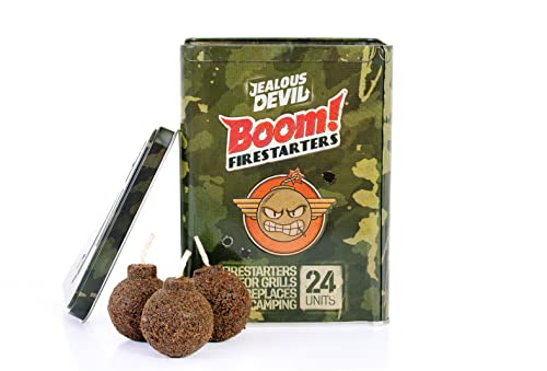 DON'T BOMB, USE BOOM. - Jealous Devil BOOM! Firestarters are organic and eco-friendly made entirely from coconut fiber. Non-toxic and safe for cookingBOOMSHAKALAKA - Jealous Devil BOOM! Firestarters patent-pending shape and formula ensure maximum performance. BOOM! Is waterproof, burns for over 20 minutes with max temps above 1000 degrees and emits a 12’’ high flame making it one of the most powerful firestarters on the marketALL BOOM. NO BUST. - Clean and odorless burn. Safe for both indoor and outdoor use. No black or acrid smoke or strong odors typical of most other firestarters on the marketGREAT BALLS OF FIRE - A single BOOM is equivalent to 4-6 traditional starters. Never use multiple firestarters again. No matter if it's lump charcoal, wet firewood, or Jealous Devil’s Onyx Binchotan, a single BOOM is all you need to get rollingTICK, TICK…BOOM! - Shaped like a bomb because that’s awesome. Every BBQ is bomb with BOOM!
