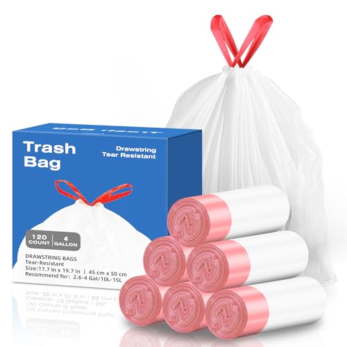 【Tear-Free Design】Easy-tear box design lets you grab tear-free rolls like tissues—no struggling, no mess, just quick, clean access every time! Each roll contains 20 pre-separated bags for instant access. You can distribute the rolls in multiple rooms. The easy-to-carry size simplifies on-the-go waste management and is ideal for car, handbag, baby carriage, etc.【4 Gal Trash Bags】This value pack contains 6 rolls of 20 trash bags (120 count). Designed for 2.6-4 gallon (10-15L) bins, these 4-gallon (15L) drawstring liners measure 17.7""W x 19.7""L to fit standard small trash cans.【Multipurpose Use】Perfect for indoor and outdoor spaces: Use in bathrooms, kitchens, bedrooms, home offices, diaper disposal units, laundry rooms, or paper shredders. Also ideal for outdoor needs like car trash bins, pet waste (dog poop/cat litter), and travel essentials.【Leak-Proof & Unscented】Crafted from premium HDPE material, these odorless trash bags combine enhanced thickness, tear-resistant construction, and reliable leak protection. The 100% fragrance-free formula safely contains messy waste without chemical smells.【Sturdy Drawstring Design】Drawstring design ensures hygienic disposal without direct trash contact, while the quick-tie closure locks odors inside. Reinforced drawstring handles withstand heavy loads and prevent strap breakage during transport to dumpster.