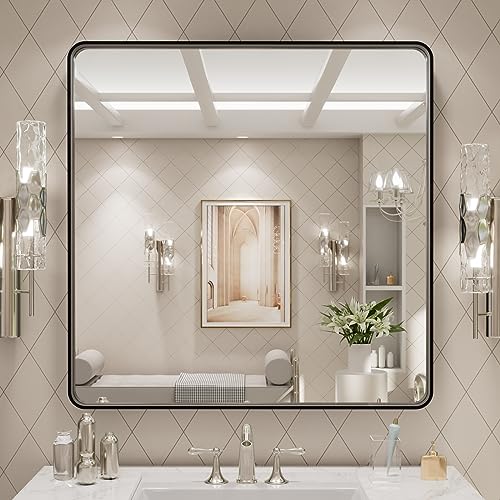 LOAAO 30x30 Inch Black Metal Framed Bathroom Mirror for Wall, Matte Black Bathroom Vanity Mirror Farmhouse, Large Rounded Rectangle Mirror, Anti-Rust, Hangs Horizontally or Vertically