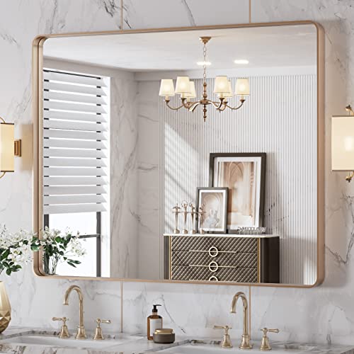 【Clear Reflection & NO Distortion】: LOAAO bathroom vanity mirror is designed with HD float glass to deliver a clear reflection with no distortion; clear lines; simple modern design【Sturdy Mirror with Premium Materials】: LOAAO brush gold bathroom mirror with 4MM tempered glass features shatter-proof, burst-proof; Aluminum alloy frame design which features anti-rust; Ideal for using in bathroom. Solid and sturdy, durable for use【Secure & Easy Hanging Option】: The sturdy wall mirror includes two Z-bar brackets; The brackets are sturdy enough to support the weight of the mirror and ensure the mirror stay securely and sturdily against the wall; Very easy to install【Safe & Secure Package】: The package for this wall mounted bathroom mirror is well and securely designed with all-around protective Styrofoam with passed drop test; no worry about the breakage【Wide Application】: A ideal contemporary mirror for wall decor with brushed metal frame, classic, perfectly goes with any decor; Suitable for using in bathroom, vanity, farmhouse, bedroom, living room, dinning room, entryway, fireplace