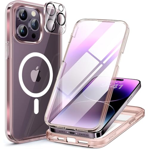 Miracase Magnetic for iPhone 14 Pro Case 6.1 inch, (Compatible with MagSafe) Upgrade Full-Body Clear Phone Bumper Case with Built-in 9H Tempered Glass Screen Protector, Magnetic Clear Pink