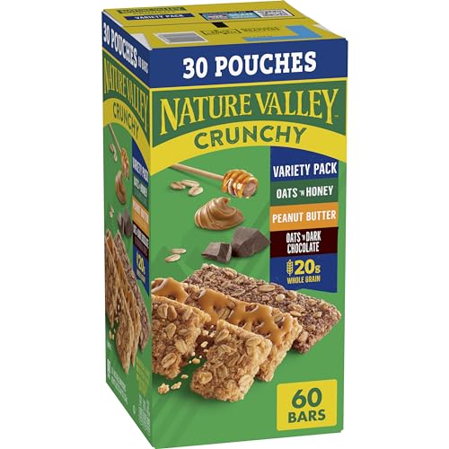 Bulk value pack: Granola bars bulk includes 60 crunchy snack bars in 30 two-bar pouches; three flavors—Oats 'n Honey, Peanut Butter, and Oats 'n Dark Chocolate; perfect for morning snack bars, convenient snacks for adults, and pantry staples.Whole grain nutrition: Each two-bar pouch delivers 20g whole grain; snack bars made with wholesome oats and no artificial flavors, colors, or sweeteners; a great choice for morning snack bars and convenient snacks for adults on the go.Variety pack flavors: Enjoy a snacks variety pack for adults with three delicious options—Oats 'n Honey, Peanut Butter, and Oats 'n Dark Chocolate; ideal for bulk snacks, lunch boxes, and pantry staples for the whole family.Individually wrapped snacks: Convenient packaging with 30 two-bar pouches makes these granola bars bulk easy to grab for lunch boxes, hiking trails, or pantry staples; individually wrapped snacks for freshness and portability.Quality Ingredients: Nature Valley crunchy granola bars bulk are made with whole grain oats; a pantry staple for convenient snacks for adults, morning snack bars, and bulk snacks for every occasion.