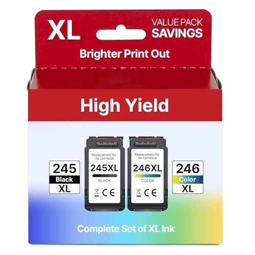 The PG-245 XL black ink is used for printing documents on plain paper and ensures sharp black text, and the CL-246 XL color ink is used for printing colorful photos and imagesXL capacity ink cartridges can help you save money, print more when you need to and extend the time between replacing ink cartridgesThis 245xl/black and the 246xl/color for canon 245xl 246xl combo pack provide peak performance that is specifically designed for compatible with Canon printersHigher Page Yield: 500 pages for Canon 245xl black ink, 400 pages for Canon 246xl color inkPackage List: 1 x black 245xl ink cartridge, 1 x 246xl color ink cartridge, 1 x user guideCompatible for Canon TR4520, TR4527, TR4522, TR4500, MX490, MX492, IP2820, MG2520, MG2522, MG2525, MG2555, MG2500, MG2420, MG2920, MG2922, MG2924, MG3020, MG3022, MG3029, TS202, TS302, TS302a, TS3100, TS3120, TS3129, TS3122, TS3320, TS3322, TS3300Exceptional quality, remarkable durability: These 245xl 246xl for cannon 245xl/black and the 246xl/color are filled with premium ink, ensure clear, crisp printed text and vibrant color images, give you a different experienceLatest Upgraded Chip: These 245xl 246xl for canon ink 245 and 246 are equipped with the latest upgrade intelligent chips, which are matched with advanced production technology and strict quality inspection process to ensure the high printing quality of each PG-245XL and CL-246XL ink cartridges