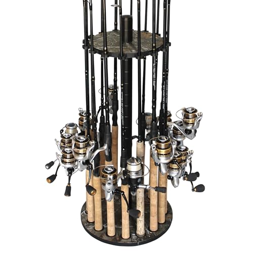 Rush Creek Creations | Round Spinning Fishing Rod Holder for 16 Freshwater Fishing Poles, Fishing Gear, and Fishing Accessories | Fishing Rod Rack with 16 Fishing Rod Clips for Garage Organization