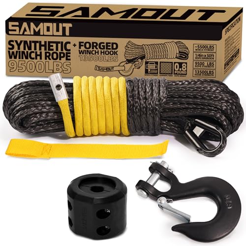 【Trustable Structure】SAMOUT Synthetic Winch Ropes are braided by 12 strands of UHMWPE (Ultra High Molecular Weight Polyethylene) and coated with Premium Urethane to increase their UV & Chemical Resistance. Different Diameter Options provide various Break Strengths for your choice. For 1/4in Dia Rope, it provides 9500 Lbs Break Strength Rating which is perfect for Vehicles under 3200 Lbs (AU Safety Factor: 1/3 of Break Strength), Recommended for Winch with 5000 Lbs Pull rating or Less.【Forged Winch Hook】 Package also includes a Fully Forged Winch hook which is made of Ultra-Strong Fully Forged Steel to provide 13500 Lbs Break Strength Rating. With SAMOUT's exclusive Coating process, these Hooks are Impact-Resist and have much longer Wear Cycle against Wear & Abrasion.【Synthetic Ropes】Ropes are designed to have 5ft Sliding Protective Sleeves to avoid Rocks cutting the Rope. What's more, we have Reinforced Metal Eye Loop Guards compared to other Branded Ropes which makes Winch Recovery much safer.【Replacement Upgrade】Synthetic Winch Ropes are not only stronger than traditional steel Cables, but much Lighter & Safer to enhance your Off-Road Experience. Rusted Steel Cables are not reliable and not easy to check their strength due to rust and corrosion, unexpected breaking Steel Cables may result in serious car damage and even human injury. You may switch your Steel Winch Cable to SAMOUT Synthetic Winch Rope anytime and it fits most Branded Winches.【Reliable Warranty】SAMOUT's Overland Recovery Products are Built to Last & designed to work as tough as you do. SAMOUT stands behind the quality of every product and we've got your back. SAMOUT's Synthetic Winch Rope is provided with 2-Year / 24-Month Hassle-Free Warranty and Lifetime Customer Support.