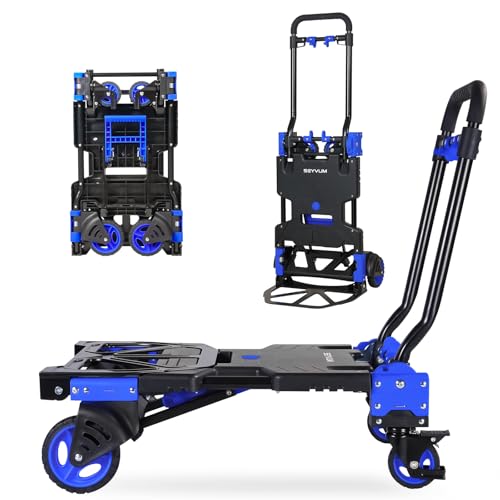 2 in 1 Dolly Cart: can be used as a 4-wheels hand truck or a 2-wheels dolly hand truck. Easy to switch from 4-wheels to 2- wheels only by hands, meet your various daily needsTwo Brakes: On smooth or sloping ground, the 2 brakes will make the cart more stable and you don't have to worry about the dolly cart sliding awayFolding Hand Truck: the foldable design makes the hand truck easier to carry and storage. Whether it is placed in the car or in the warehouse, it will not take up much space; Folding size: 18.1 * 25.2 * 4.7 inchRetractable Handle: 3 adjustable heights: 26.8-inch, 31.5-inch, and 36.2-inch; suitable for most heights, thickened steel handle makes the dolly more durable, easy to push and pullWide Application: the SEYVUM shopping cart can be used for transportation, camping, factories, warehouses, offices and etc; One cart for multiple uses, freeing your hands