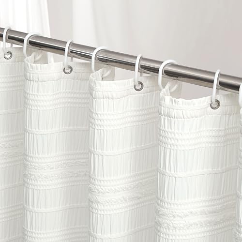 Farmhouse Shower Curtain - Cloth shower curtain featuring a pinched pleat striped and waffle that will add a touch of fashion to your bathroom. The rustic shower curtain is the perfect blend of elegant, romantic, cute, shabby chic, vintage, and charmYou Can Get - 72"W x 72"H white shower curtain and 12 hooks. Cute white shower curtain fits standard bathtubs, ideal for any bathroom. This waterproof shower curtain keeping water off your floors and giving you the privacy you need, perfect for daily use and keeping your bathroom neat and dryEasy to Install - The white fabric shower curtain is made of high-quality polyester fabric, and the reinforced top with 12 metal holes prevents tearing to ensure durability and wear resistance. Heavy duty shower curtain is also equipped with 12 C-shaped hooks for quick installationMachine Washable - Fabric shower curtain machine washable in cold water with mild detergent and quick drying.If you have any issues with our product, please don't hesitate to contact usMulti Scenario Application and Gift - Elegant shower curtain perfect for bathrooms, hotels, or as a thoughtful gift. Shower curtain cute bohemian style design complements various decorative styles and a good choice for bathroom decor