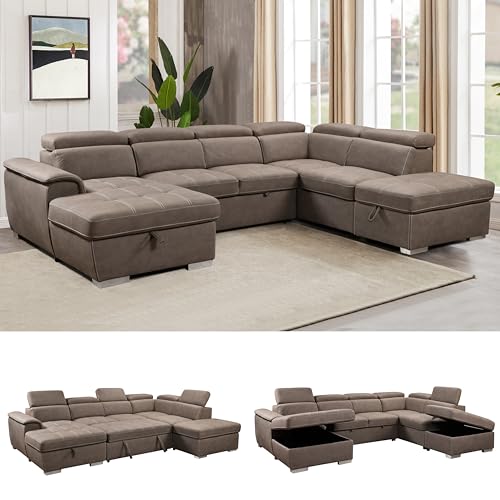 Generous Dimensions: Measuring 127.16W x 86.61D x 32.09H inches and weighing 422.40 lbs., this spacious 7-seater sectional sofa provides ample space for guests and family members.Convenient Pullout Sleeper: The U-shaped sleeper sectional couch allows you to pull out the middle love seats to form a sofa bed, providing a comfortable sleeping surface for guests or family movie night and maximizing the space in your living room.Ultimate Comfort & Support: Dive into 7 inches of thick seating cushion, coupled with a thicker padded backrest and headrest. The sofa also features 6 adjustable headrests and attached backrest cushions to ensure unparalleled lumbar support.Pet-Friendly Microfiber: This Sleeper couch is made of pet friendly microfiber, which is both fashionable and durable. The microfiber material not only has a soft touch, but also prevents stains, scratches, and peeling.Easy Assembly & True Comfort Design: Our sofa is shipped via LTL delivery and features KD (knock-down) Unlike small-package sofas designed for courier shipping, which often compromise comfort by reducing seat height, cushion thickness, and seat width, our sofa arrives closer to full size. This ensures a more spacious and comfortable seating experience, combining effortless setup with the quality and comfort you deserve.Multifunctional Features: Beyond its seating function, this sectional hides a 51.25 x 22.75 inches pull-out bed, transforming the overall sleeping area to 96.5 x 46.5 inches when extended. Furthermore, Make the most of your living space with convenient storage compartments. Whether in the left chaise or the standalone ottoman, easily store away blankets, games, and more by lifting the cushion.Trusted Brand & Customer Support: Manufactured by the reputable THSUPER brand, this sofa comes with a factory-direct support for prompt resolutions of any customer queries and concerns. You can be sure that your purchase is backed by reliable assistance.