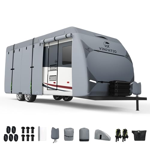 ✔【Upgraded Material】We upgrade rv cover top from 3 layers to 7 layers now! More durable and lasting. Top 7-ply non-woven fabric with built-in waterproof membrane and anti-UV treatment help to better avoid aging, disintegration and tearing due to exposure to the sun. Let your rv cover get a longer service life!✔【Excellent Waterproof Performance】Our RV cover features a 100% waterproof PU coating with a rating of 2000mm, providing exceptional waterproof protection. Whether it's heavy rain or snowstorms, Our RV cover ensures complete waterproofing, keeping your RV dry and safe.2 reflective strips in front and rear for safety avoid collision during night.✔【Enhanced UV Protection】Our RV cover is equipped with an additional UV-resistant coating, effectively reducing aging and degradation caused by sunlight. Our rv cover provides superior UV protection, extending the lifespan of your RV exterior.4 rollable zippered doors- 3 on right side 1 on rear side allow you access to the RV doors and engine areas anytime, easy to view and check internal situation.✔【Windproof and Complete Accessory Kit】Our non-woven fabric RV cover comes with a range of practical accessories. It includes windproof straps to securely fasten the cover around the RV body, preventing it from being blown away or torn. Additionally, we provide 6 drain gutter covers with sponges to prevent any scratches during installation. We recommend covering or padding any sharp edges with a towel, cloth, or foam pad to prevent damage to the cover.✔【3-Year After-sale Service】Buy with confidence and enjoy our 3-year replacement support. You can consult us at any time if you have any inqueries about product. We always offer excellent customer service for this item.