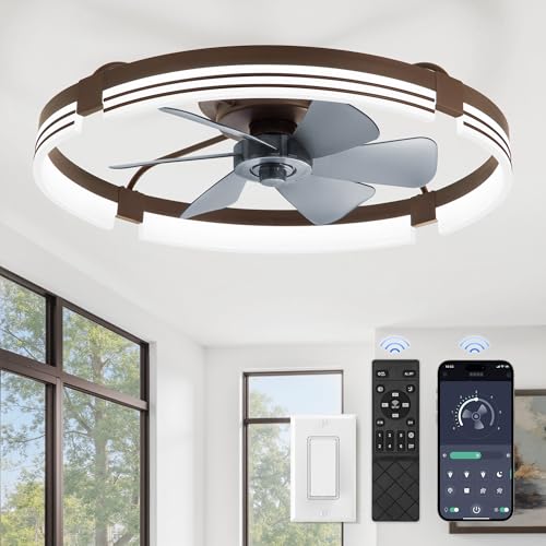 ZMISHIBO 24 Inch Low Profile Ceiling Fans with Lights and Remote, 3000K-6000K Dimmable Fandelier LED Fan Light, Flush Mount Ceiling Fan with Light, 6 Wind Speeds Ceiling Fans for Bedroom- Brown
