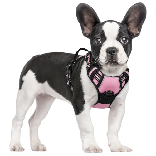 Small Dog Harness - Recommended Breeds: Small Dogs, such as Havanese, Corgi, Pug, Puggle, Terrier, etc. Please measure the size carefully before purchasing this present for your puppy. Make your puppy stand out with this Cherry Pink Harness!No Pull, No Choke - Our non-pulling dog harness is specially designed with 2 metal leash rings for safer dog walks. Use the chest attachment clip to stop your dog from pulling on walks, perfect for dog training or dogs who tend to pull. The back one is great for casual walks, jogging, hiking, etcEasy to Use - This hassle-free overhead harness is easy to put on and take off with its 2 fast-release buckles. Slide the harness over your dog's head, buckle it up, adjust the straps, and here you go! Grab the top handle for additional control. Lightweight and easy to cleanFully Adjustable - This adjustable harness features 4 easy adjusting straps around the body. You can use its 2 neck straps and 2 chest straps to create a perfect fit for your dog with some room of growth. No worries about slipping out or chokingSafe and Comfortable - Your dog will enjoy the daily walk in this comfort dog harness! Made of sturdy nylon oxford and padded with soft cushion to protect your dog's skin. Breathable air mesh keeps your dog cool during outdoor activities. Super bright reflective strips ensure a safe walk both day and night