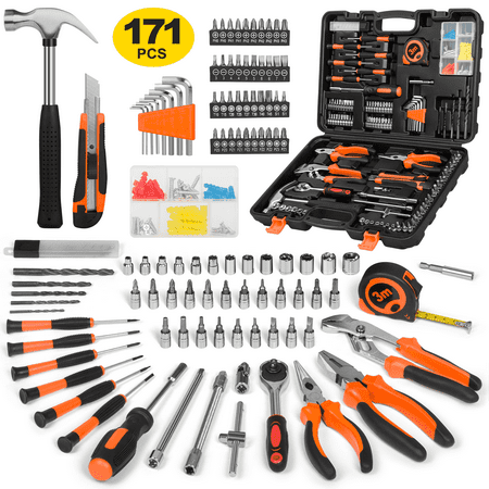 This tool kit is equipped with a full set of tools with high specifications. Whether it's home decoration or manual DIY, this toolbox can meet your needs. The tools are made of high-quality materials, beautiful and wear-resistant. The box is designed with tight card slot, the arrangement of tools is clear at a glance, and the storage is more orderly. It contains common household tools, which can meet the needs of families in multiple directions and is worth the money. Features: PRECISION The smaller size makes the job more delicate. A variety of drill bits with magnets are more suitable for different applications. Precision screwdriver makes repairs more precise. DURABLE Quenching technology, super high strength, Chrome vanadium steel forging. Fully polished head. Wave edge handle is designed according to your hand-held shape. Diversity Our home tool set comes with a rich collection of tools to suit any job. A combination of a variety of basic tools: tape measure,hey key wrenches,ratchet wrench,bit holder and so on. PORTABLE This tool set comes with a sturdy case to protect and house all your tools in one place. This makes it easy to carry tools around to your area of work whilst keeping everything neatly organized and ready to store away when you're done. COMPLETE VARIETIES Contains tools needed for most small repairs and basic DIY projects around the house.Perfect for Handymans, repairmen, mechanics, body shops etc. Also a great tool set to have at home, garage and the workshop. Product Description: Color: Orange Material:Alloy Steel, Plastic Item Dimensions(LxWxH): 16.54 x 11.54 x 3.23 inches Item Weight:8.38 LBS Package Included: (1) 8-Piece Hex Keys 1/16", 5/64", 3/32", 1/8", 5/32", 3/16", 7/32", 1/4" (2) 1-Piece Tape Measure 10FT (3) 6-Piece Precision Magnetic Screwdrivers SL2.4, 3.0; PHOO, O; T6, T10 (4) 1-Piece Bit Holder 8" (5) 1-Piece Bit Extension Rod 2" (6) 1-Piece Utility Cutter 17mm (7) 5-Piece Cutter Blades 17mm (8) 60-Piece Wood Screw Assortment Kit (9) 40-Piece Screwdriver Bits (10) 5-Piece Twisted Drills 5/64,1/8,5/32/32/3/16,1/4" (11) 1-Piece Long Nose Pliers 6" (12) 1-Piece Linesman Pliers 6" (13) 1-Piece Tongue And-Groove Pliers 11" (14) 1-Piece Claw Hammer 8oz (15) 1-Piece Ratchet Wrench 1/4" (16) 1-Piece Universal Joint (17) 1-Piece Flexible Extension 6" (18) 1-Piece Extension Bar 6" (19) 1-Piece Sliding t-Bar (20) 21-Piece 1/4" Bit Sockets: SL4,5.5,7,PH1,2,3PZ1,2,3 HEX 3,4,5,6,7,8 T10,15,20,25,30,40 (21) 13-Piece 1/4 DR Metric Sockets: 4,4.5,5,5.5,6,7,8,9,10,11,12,13,14 mm
